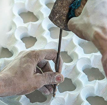 Shwet’s artisans, the Ustajis, are amongst the most talented in the world. Their community has been rooted in Makrana for centuries, and they carry the wisdom of generations within them. These artisans could be described as masters of light, thanks to their ability to draw out the fine glow within the stone.
